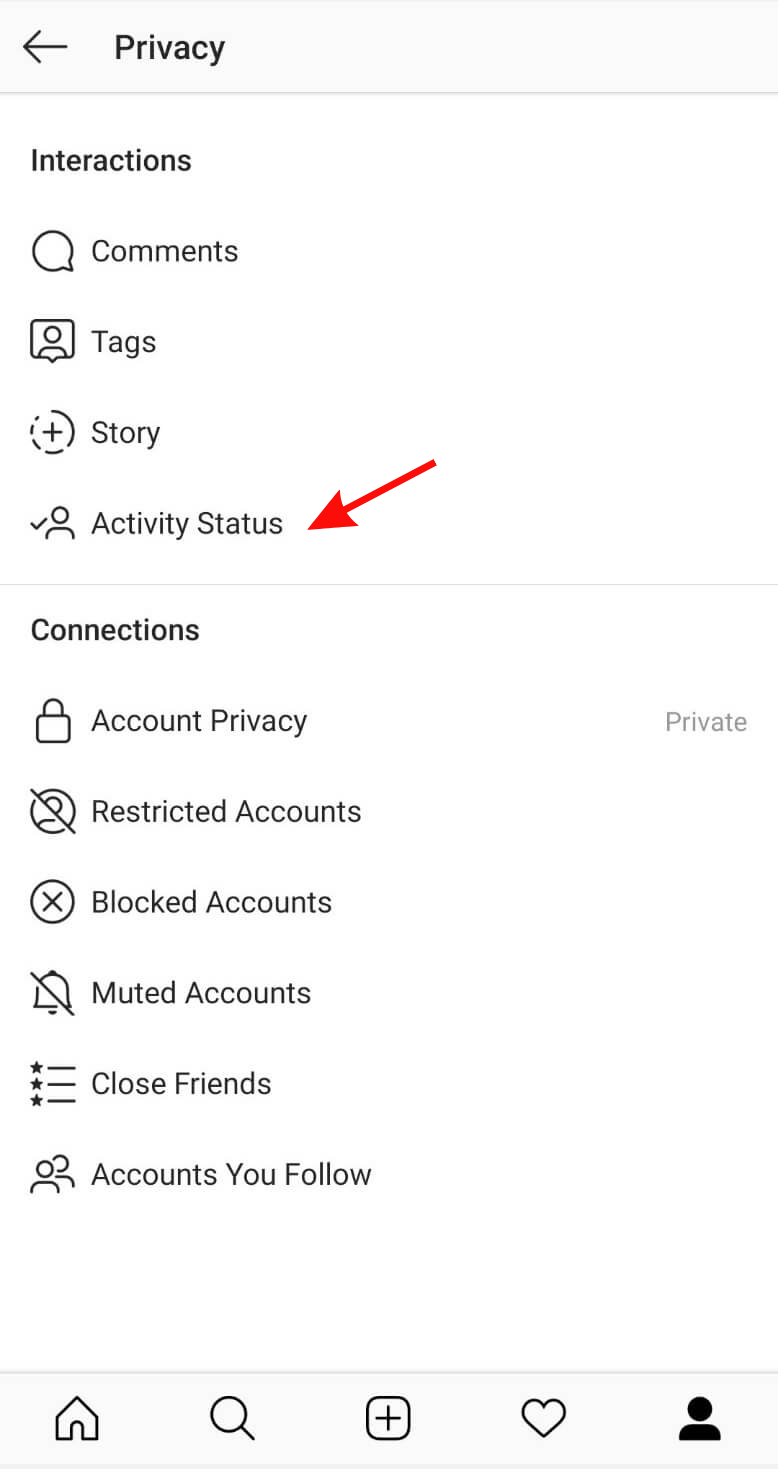 Within the Privacy settings, locate the “Activity Status” option and tap on it. The Activity Status setting allows you to control whether people you follow and anyone you message can see when you were last active or currently active on Instagram.